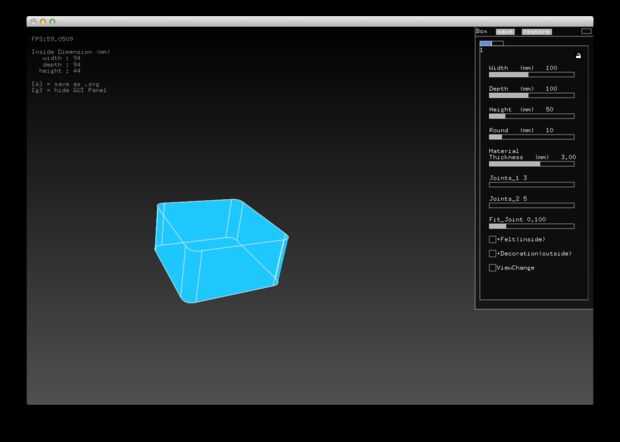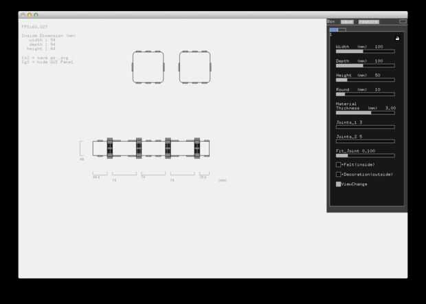 画面上でBoxの幅、奥行き、高さ、R の掛かり具合などをシミュレートし、図面を生成することが出来きます。 図面はsvgデータとして書き出されillustratorなどのドーイングツール上で編集する事が出来ます。 通常のBox を作るための『NormalBox』と角にR がついたBox を作るための『RoundBox』があります。