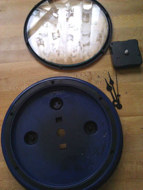 La cara original fue hecha de un plástico flexible delgado pegado en la caja, y quité también. No se muestra en las fotos porque lo destruyó en el acto de extraer. Otra razón para eliminar el movimiento: el agujero en el centro, resulta más fácil empujar la cara vieja. La ventaja aquí es, este reloj tiene un pegamento muy pegajoso que todavía pegajoso después de quitar la cara y debería funcionar bien para sostener la nueva cara de.