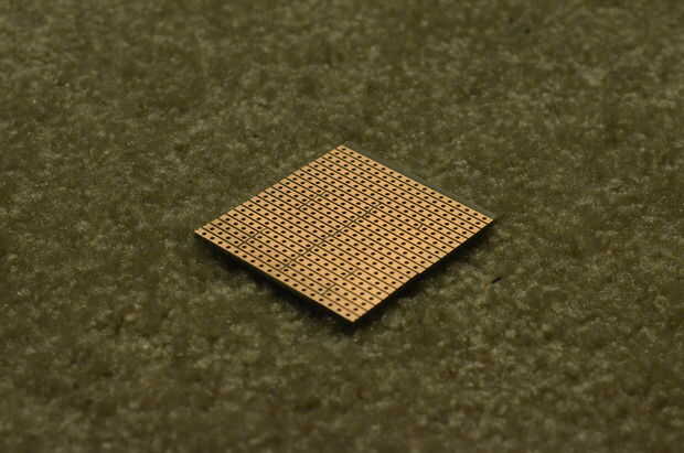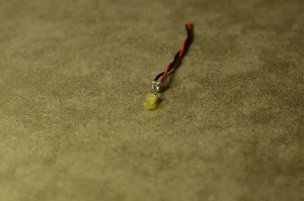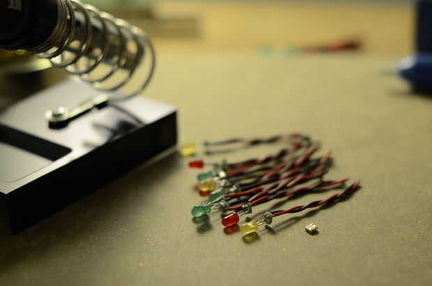 En lugar de soldar los LEDs directamente a nuestra tarjeta de circuitos y riesgo equivocarse las alturas de los LEDs en la superficie del reloj, he opté por conectar los cables a la parte posterior. Hice esto corte de 14 plazas de 2 x 2 perforboard, para que los ánodos y cátodos pueden conectarse a los cables fácilmente.
