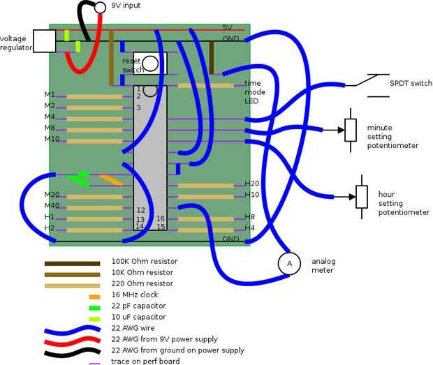 El SPDT interruptor y potenciómetro debe tener un extremo atado en el riel de 5V y el otro extremo unido al carril de tierra. Además, todos los LEDs (M1, M2... M20, M40, H1, H2... H10, H20 y el modo de tiempo LED) necesitará el ánodo conectado a las etiquetas en el dibujo y el cátodo conectado a cualquiera de los carriles de tierra.
