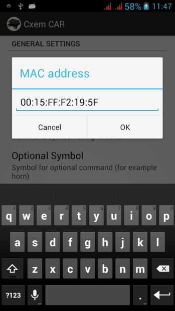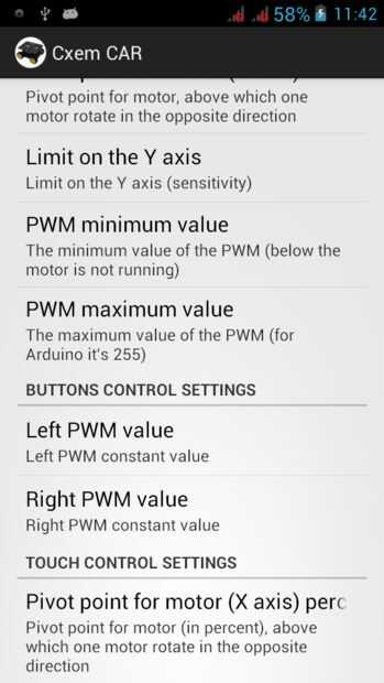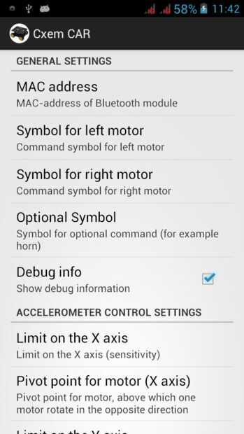 Para establecer una conexión con el módulo de Bluetooth del coche de RC, debe establecer la dirección MAC en la configuración de la aplicación. Pero en primer lugar, debe configurar el par los dispositivos Android-dispositivo: abrir ajustes -> Bluetooth y haga clic en "Buscar dispositivos". Cuando el teléfono encuentra nuestro módulo de Bluetooth, haga clic en ellos e introduzca la contraseña para el emparejamiento (generalmente "1234")