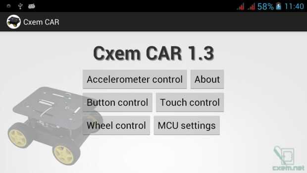 La aplicación contiene varias actividades. Actividad principal es una pantalla de inicio con botones de configuración y modos de funcionamiento diferentes