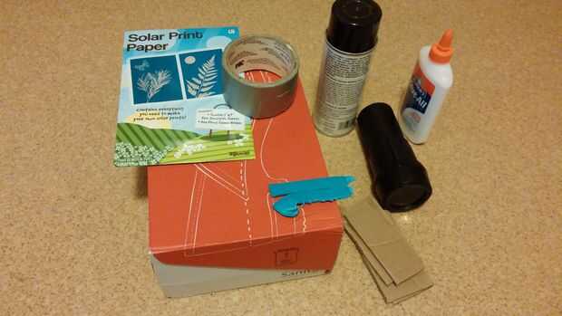 La mayoría de los materiales necesarios son en la foto 1. La caja de zapatos, cinta adhesiva, pegamento para madera y cartón son para el montaje de la lente en la caja. La pintura es negro mate. El papel de impresión Solar era de $ 7:00 en una tienda de juguetes local. No se muestra, pero usado, eran palos de picar de madera baratos para listones y cuñas - podrían también utilizarse palitos.