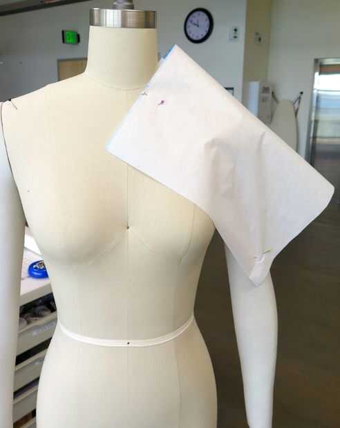 Cortar una pieza de patrón de papel cerca de 15 "x 15" y pin que en la parte delantera de la forma del vestido como se muestra, por lo que recorre el hombro y brazo superior.