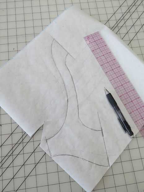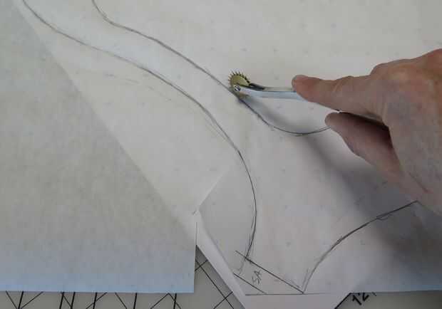 Transferir su patrón colocando el papel sobre un trozo de oaktag, asegurar ligeramente con alfileres o cinta y trazar sobre las líneas con una ruedecilla. Retire el patrón de papel de la oaktag.
