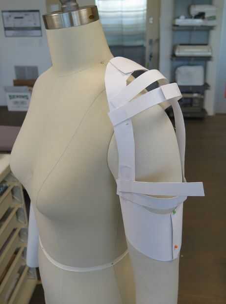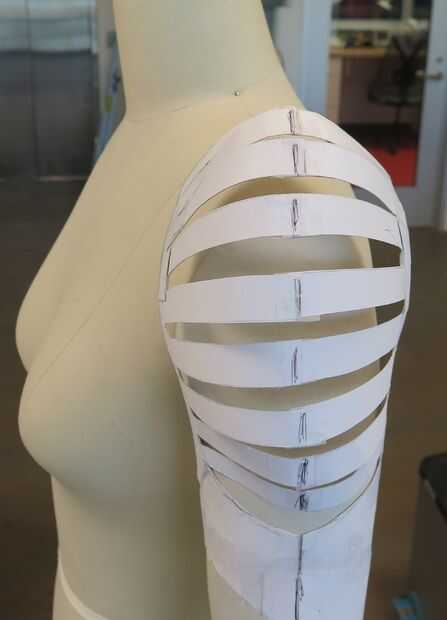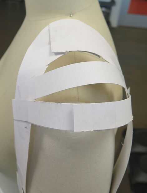 Cinta de estas tiras en la base del patrón, arqueadas sobre los hombros de delante hacia atrás para crear los listones. Comience con los listones superior e inferior, tratando de hacer su forma de fluir suavemente desde el hombro y el brazo y luego continuar hacia el centro.