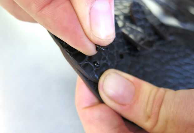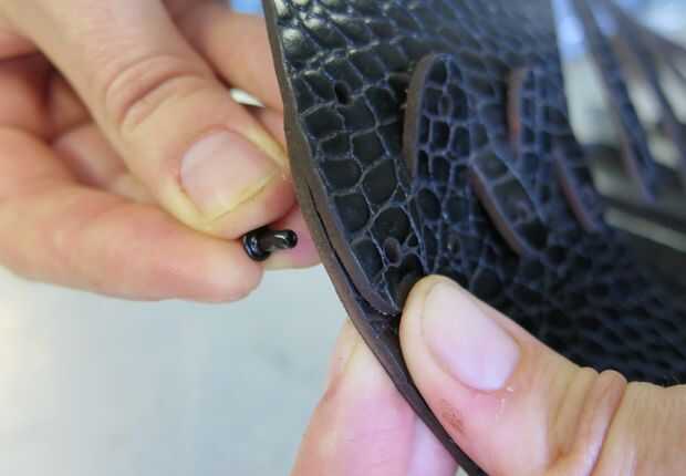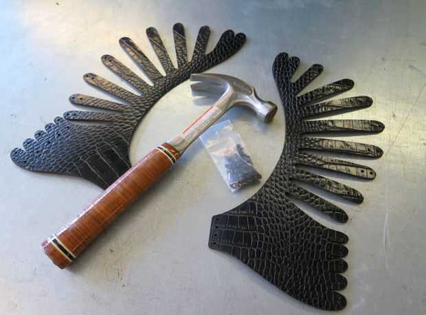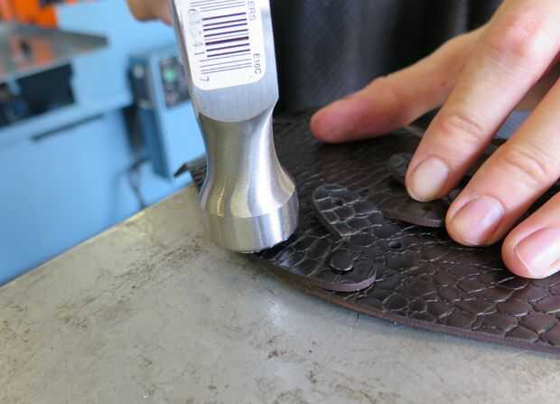 Tomar la pieza limpia una mesa acero, tabla de cortar o pequeño yunque metálico de remachado. Empezar por clavar las fichas en el brazalete.