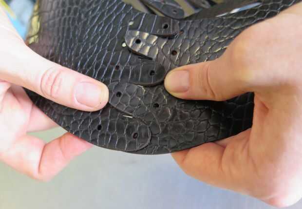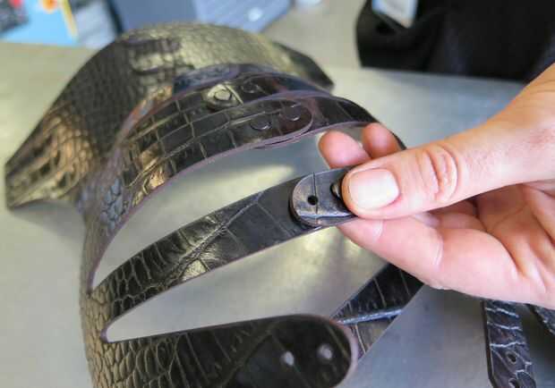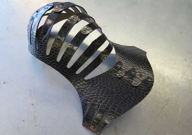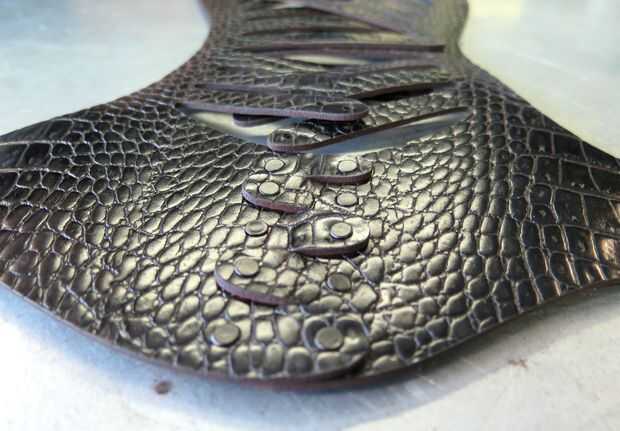 Se les superponen alternativamente y en los remaches, insertando el lado largo del remache de la parte posterior y conexión el lado corto de la parte delantera. Golpee los juntos suavemente pero firmemente con un martillo. Una vez que han clavado las lengüetas en el brazalete, pasemos a los listones, continúan la superposición se alternan hacia arriba a través de los listones y la ficha de hombro.