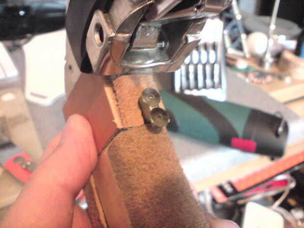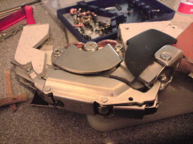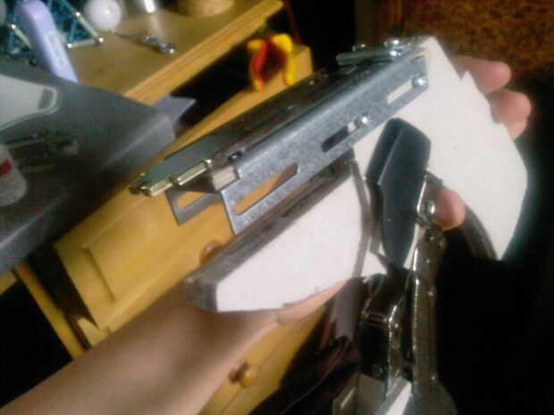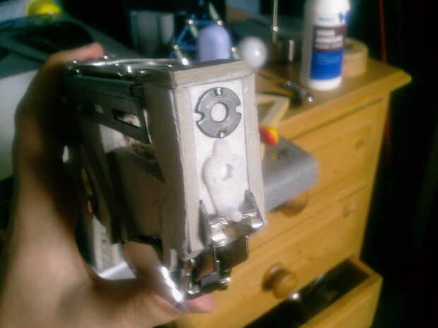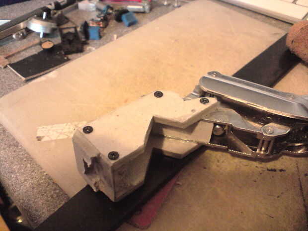 -Añadir un pequeño disparador, usé una vieja bisagra de portátil, con unos tornillos.