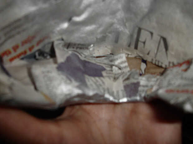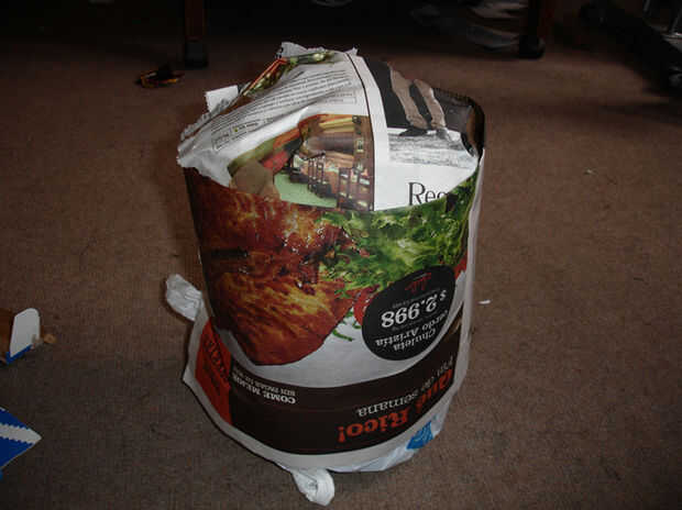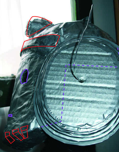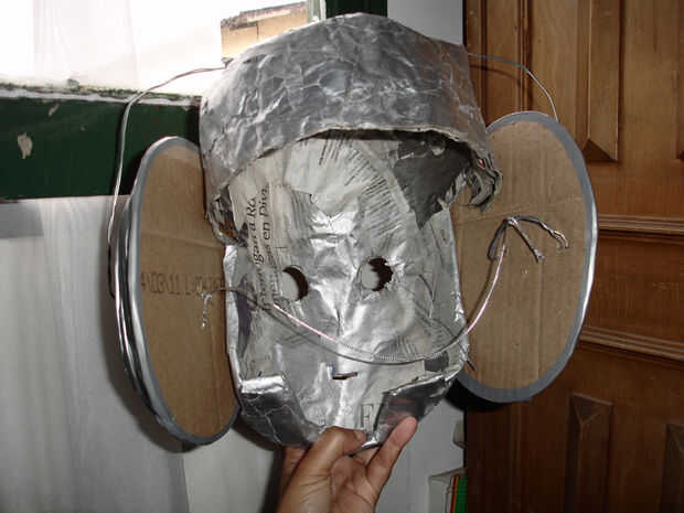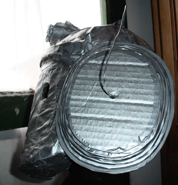 Los materiales son periódicos, pegamento, cartulina, alguna cadena (tuve que coser las piezas laterales a la cabeza para mantenerlos en su lugar), cinta adhesiva, alambres, tijeras, cortador, pintura en aerosol y algunas bolsas de plástico.