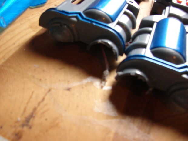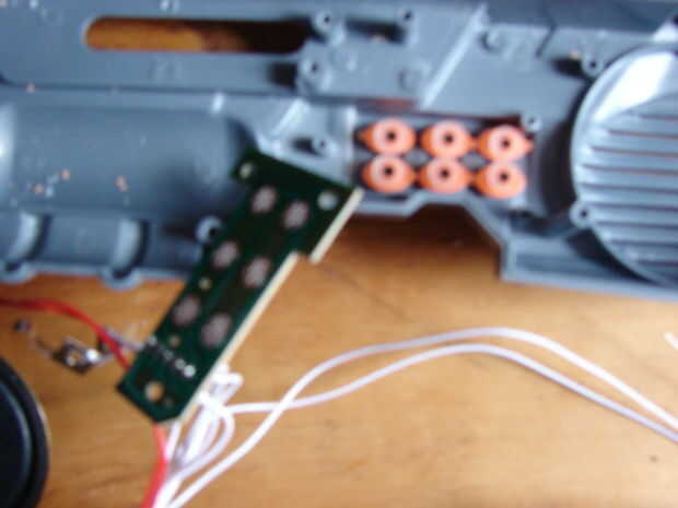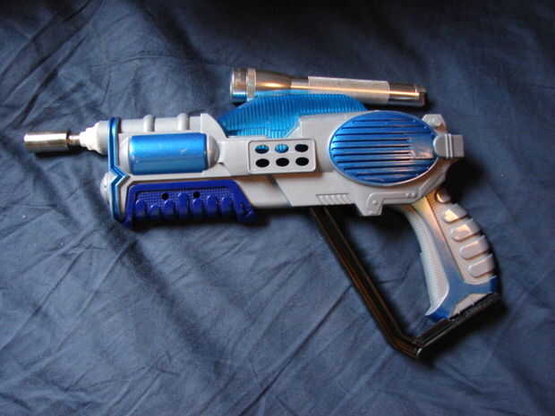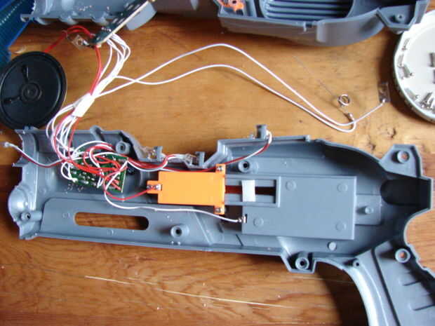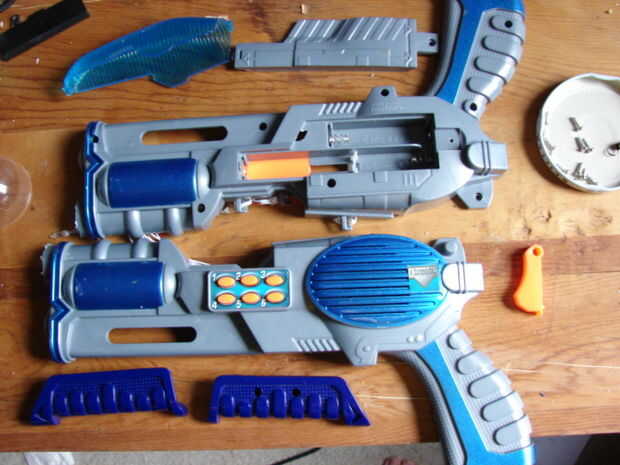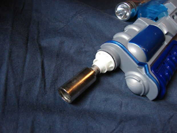 Desarmar la pistola, sacar los tornillos, encontrar ninguna pega o calor soldado con autógena puntos. Tuve suerte y solo la boca naranja brillante fue pegada en. Esto salió bien porque estaba aserrado de todos modos.