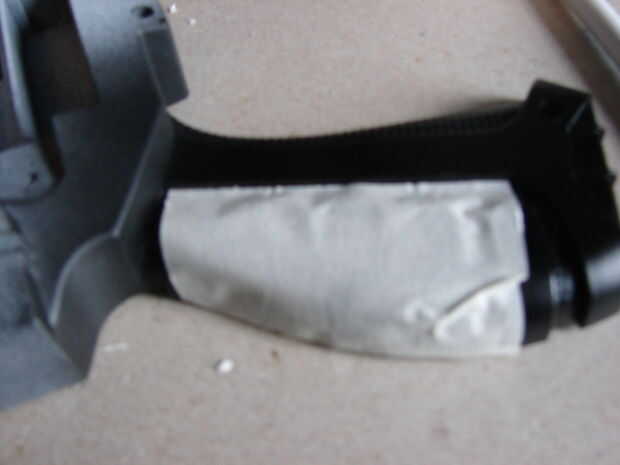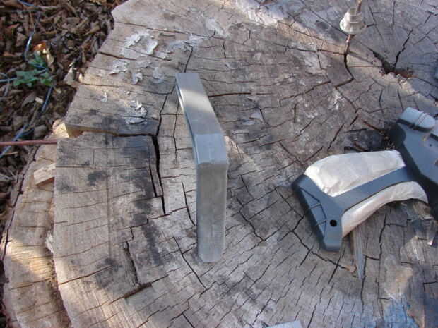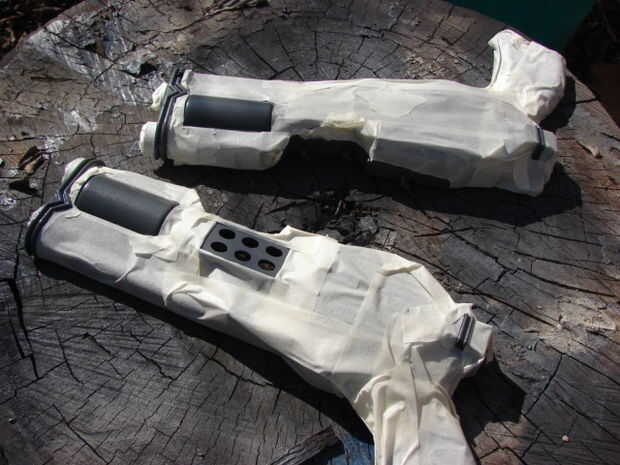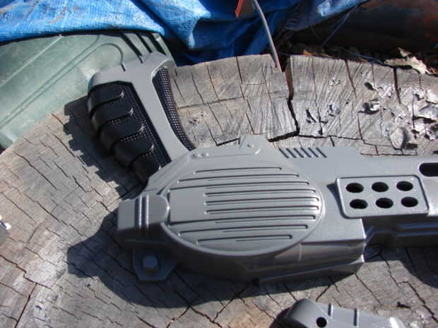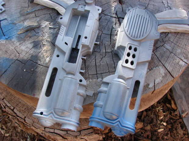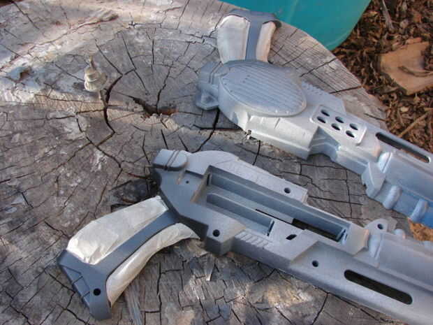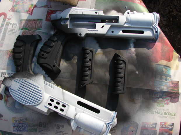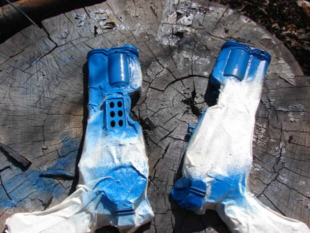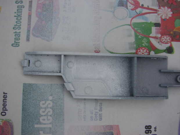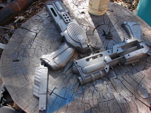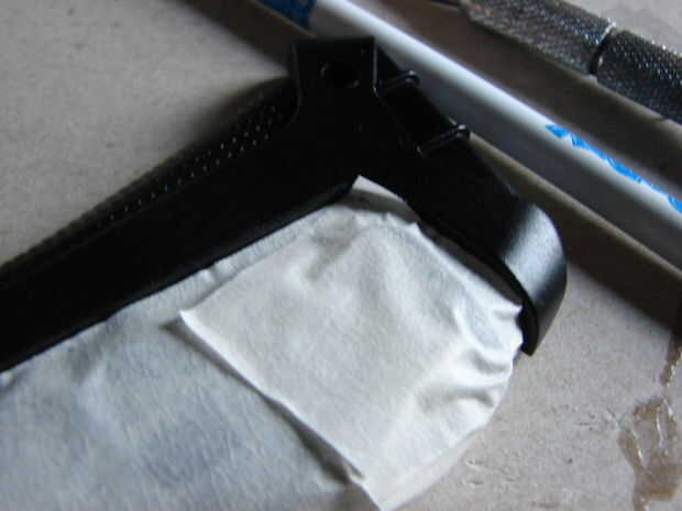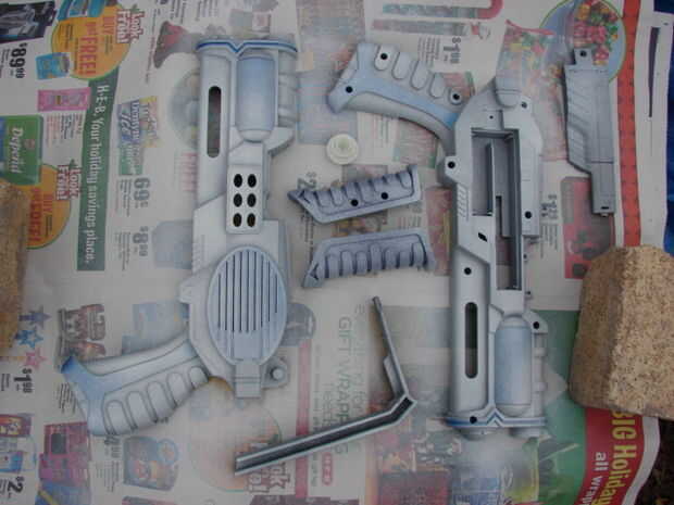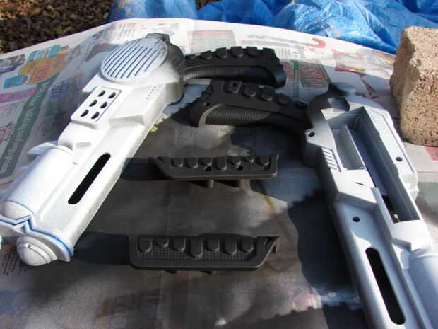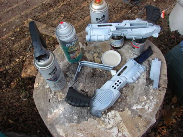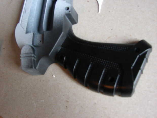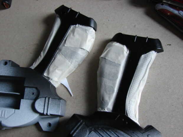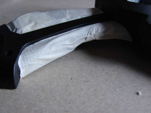 Establecer primero una mano de imprimación. Una empuñadura de pistola es de gran ayuda, más fácil con los dedos = mejor trabajo de pintura. Uso de movimientos rápidos y suaves capas de luz y dar tiempo para que la pintura se seque entre capa y capa. Iniciar el flujo de pintura al lado de la pieza y barrido sobre él. Al utilizar diferentes colores, pintar de un color (en mi caso negro en el mango), dejar secos completamente y enmascarar con cinta de pintor azul. Luego pintar el siguiente color (plata), dejar secar y máscara. Repita hasta que todos los colores se utilizan.