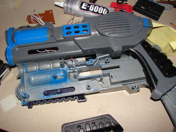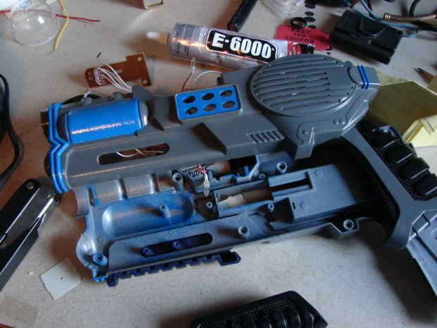 Ahora es momento de empezar a armar cosas. Puse mis pedacitos de electrónica y llegó al descubrimiento que tengo que alargar el cable de una bombilla para que quepan en la boca. Grietas a la soldadura, hierro y los cables, longitud del cable mayor. Utilizando tus fotos/esquemas como referencia y poner de nuevo en todos los órganos internos. Asegúrese de que todos los varios resortes, interruptores y todo eso están donde deben estar. Todas las funciones de prueba antes de atornillar detrás juntos, prueba otra vez. Avanzar al siguiente paso.
