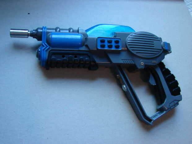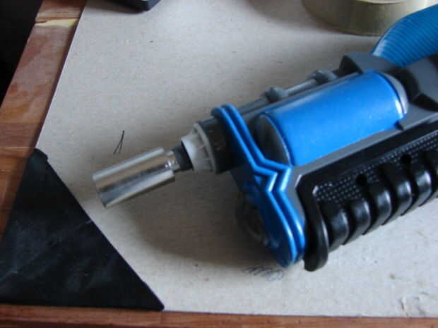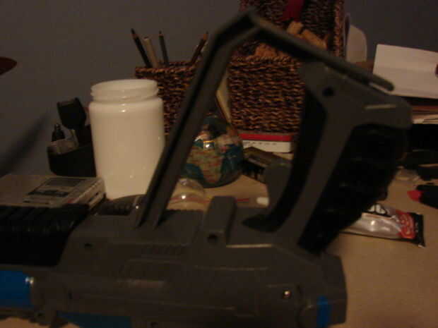 Primero pegué el protector de mano en (picado de un rollo de cable de extensión) y luego el montaje de barril. Voy a tener que repintar algunas como el pegamento y pintura no se llevan...