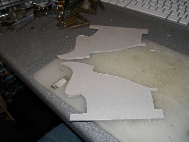 Fotos 5 y 6 muestran la ubicación de las secciones de la tarjeta (una en cada cara) y un diagrama que muestra la colocación de la bandeja de disco duro. Estas secciones se celebraron con pegamento de pva, con cinta adhesiva en su lugar hasta su secado.