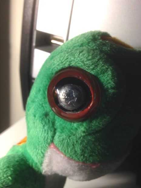 Triste niño viene a mí con su peluche Gekko, un ojo ha roto. Podemos reconstruirlo, tenemos la tecnología...