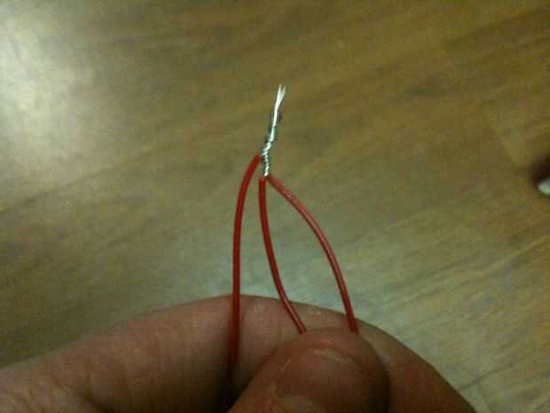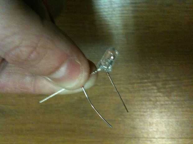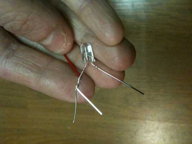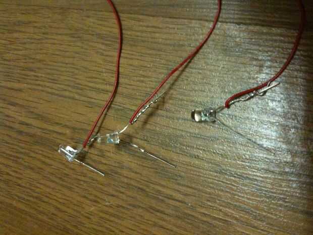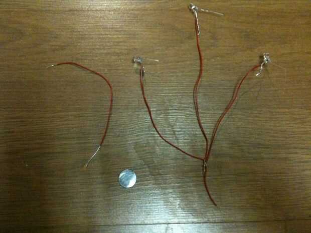 Ahora toma las piernas largas (positivo) de cada LED y conecte los tres cables juntos, uno tras otro. Debe enrollar con algo que se ve así: