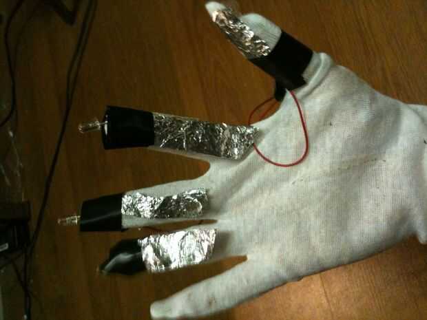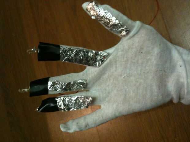 Verás que aunque los LEDs están cubiertos con cinta, puede completar el circuito, si se toca el dedo pulgar en el extremo inferior de la hojalata en cada dedo, deben todavía luz. Pruebe cada dedo y ver si funcionan!