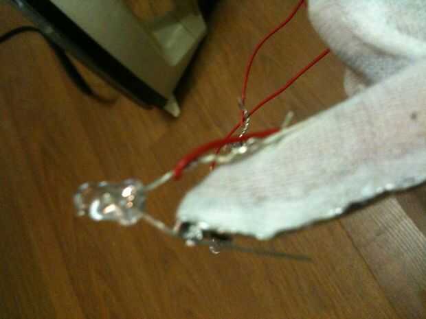 1. Tome su circuito y puente cuidadosamente cada uno de los LEDs sobre la punta de cada dedo. El extremo corto de cada LED (el extremo negativo) se debe colocar cuidadosamente sobre el papel de estaño. Utilizando un trozo de cinta aislante, Enrolle firmemente el LED en lugar así es presionando hacia abajo sobre el papel de estaño. Va a ser tu conexión, así que asegúrese de que está firme! Hacer esto para cada dedo!