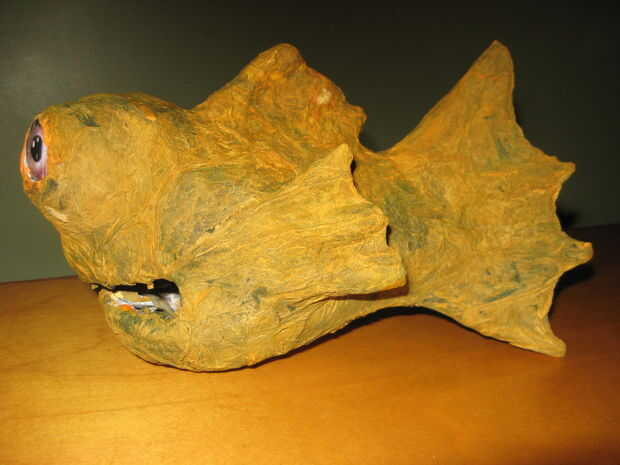 trata de un goldfish del animal doméstico que no necesita alimentación o su agua cambia. Está hecho de papel y se sienta encima de un servo que gira para cambiar de dirección y oscila para simular la natación.Un Picaxe 08m microcontrolador controla e
