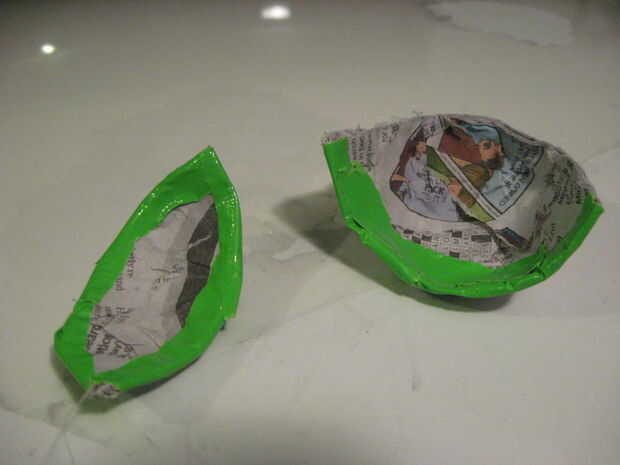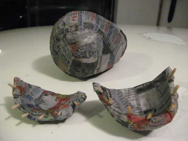 Tomar una de las bolas que hiciste. Corte con cuidado la bola por la mitad. Usé un viejo cuchillo de cocina dentada para hacer el corte. Si usted permite suficiente tiempo para el secado, el núcleo de periódico que no estaba mojado en pegamento debe tirar fácilmente de la cáscara de maché de papel duro. Corte esta la mitad una vez más, dando por resultado dos trimestres de la pelota total.