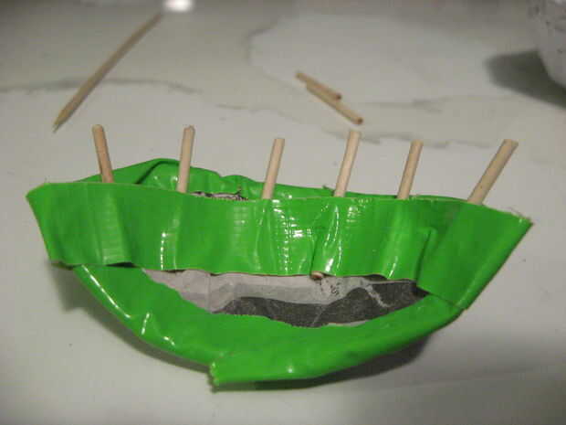 Para los dientes, he utilizado palillos de dientes que fueron cortadas a un tamaño apropiado y con cinta en su lugar. Una vez me ha gustado cómo miraban los dientes, aplican otra capa de papel maché para cubrir la cinta y sellar en los palillos.