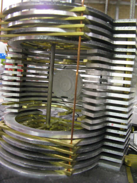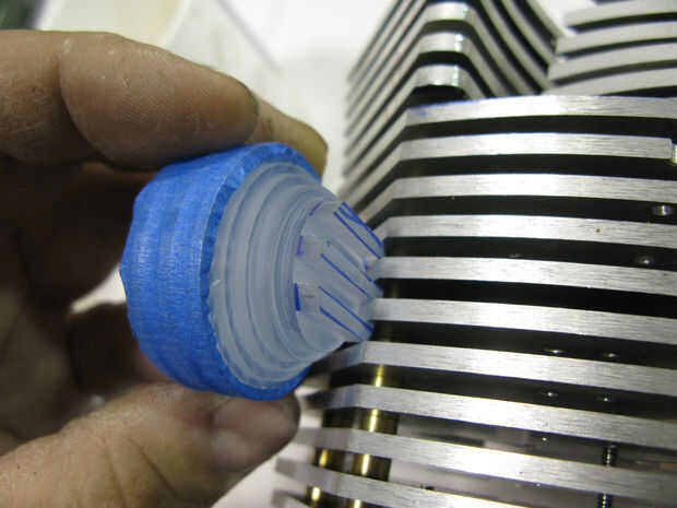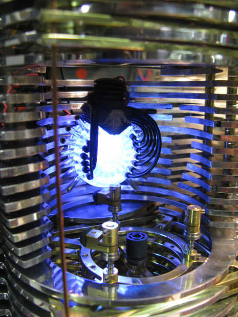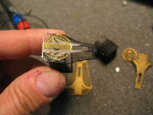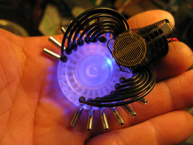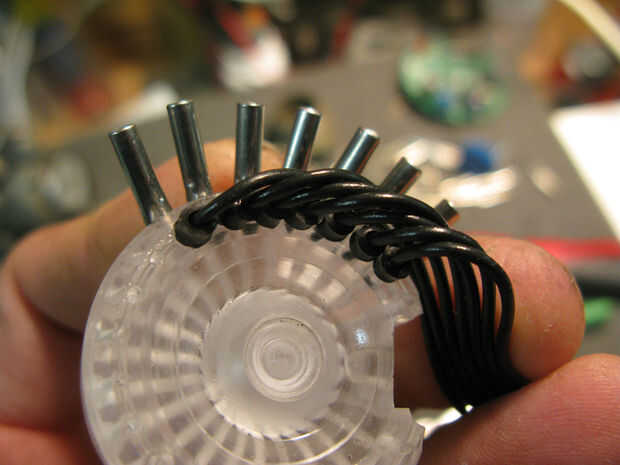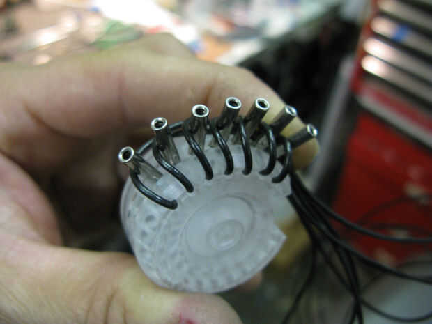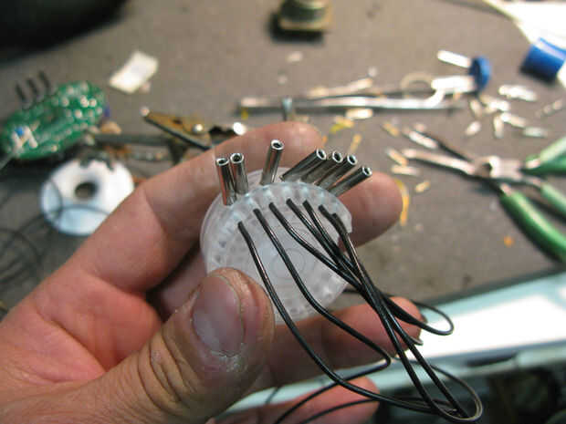 Ranuras fueron trabajados a máquina en la parte posterior de la pieza de acrílico reactor que anidan entre las placas, como pasos, más adelante la central levantado "paso" fue perforadas y golpeado ligeramente para arandelas y hardware a aplicarse desde el compartimiento de la electrónica. otro conjunto de cables con un lado femenino y el otro macho de lado será alambre de la Ondina al reactor...