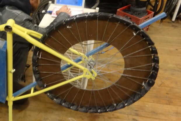 El disco de la animación es láser de corte de 1/8" conglomerado con agujeros para conexión a radios con ataduras de cremallera. Este disco tiene ranuras para tarjetas de 16-2,5 x 3" y es de tamaño de una rueda de la bici de 26". Un pedazo de velcro trasero pegajoso en cada ranura de la tarjeta permite secuencias de animación diferente a ser cargado. Las animaciones son dibujados a mano en las tarjetas (mitades de tarjetas 3 x 5") y luego fieltro se pega a la espalda para que se peguen a la cinta de velcro.