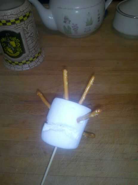 D. identificar qué lado de la melcocha tiene la boca (la ranura de corte) que será la cara. Luego se pegan los palitos de pretzel en el malvavisco en todo excepto la cara. Los palillos del pretzel deben ser lo suficientemente profundos para quedarse en el malvavisco cuando el malvavisco se sumerge en la fondue. Coloque tantos palitos de pretzel en el malvavisco como usted desea.