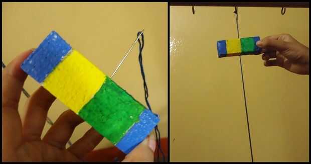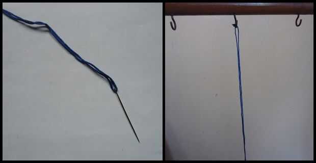 Ahora encontrar un lugar para colgar el hilo de rosca, cuélguelo mantenga la aguja colgando de la parte inferior.