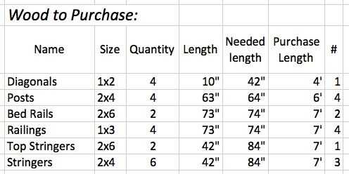 - Carriles de la cama: Dos 2x6s, 73" de largo