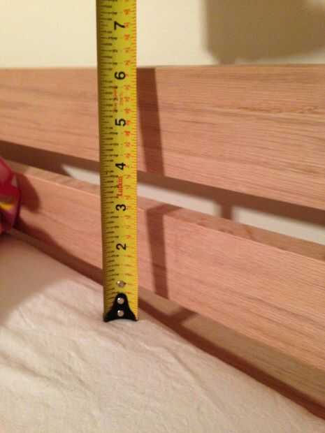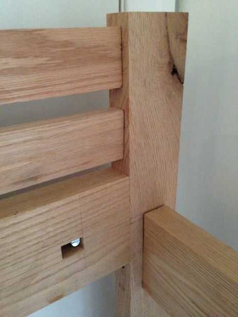 Comience con el marco de la final con sólo 3 largueros. Pone a su lado en un gran espacio abierto y luego ajuste el riel de cama principal en su lugar con los tacos. Si no puede conseguir el riel para sentarse a ras contra el puesto, tendrás que perforar los agujeros de taco un poco más. Asegúrese de que cada par de opuestos pasador agujeros están sobre la misma profundidad que los tacos sentarse a mitad de camino entre las dos piezas.