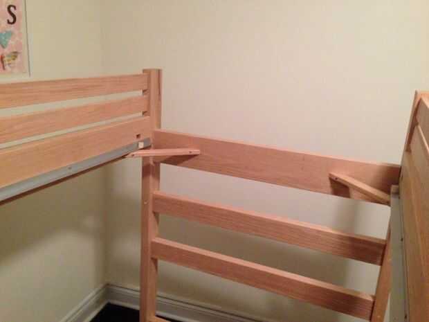 Ahora que ya tienes los rieles de la cama en un lado conectado, gire la cama su otro lado. Repita el mismo proceso para los otros carriles de tres camas, luego levante la cama vertical.