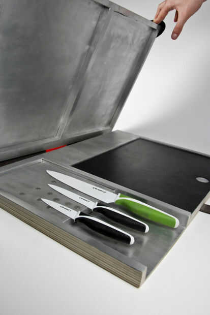 En la parte inferior tiene un lugar para poner tus cuchillos y tabla de cortar