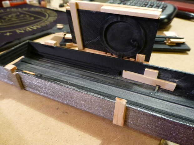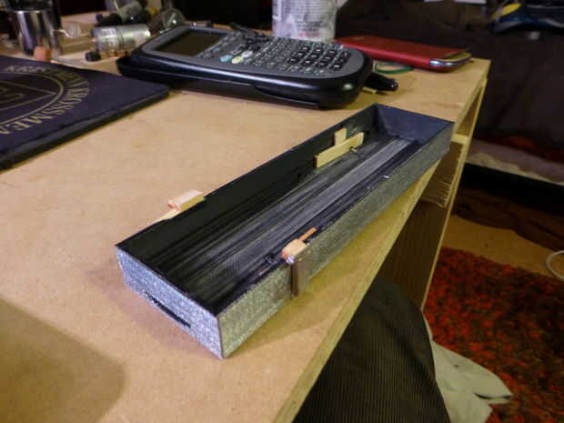 Una vez que las clavijas de sujetar las paletas en su lugar, deslice la hoja en la caja también. Planeará muy suavemente (debe sentirse como flota) a través de la pista. Si no siente este suave, utilice un papel de lija muy fino para suavizar hacia abajo.