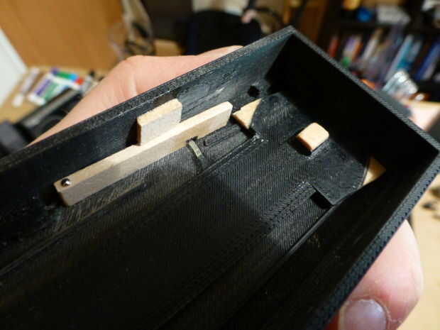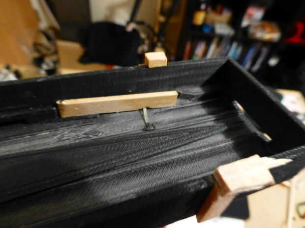 El primer paso para la Asamblea es pin en las paletas en el caso base. Los orificios de las paletas ya está impreso en la pieza. Si son demasiado pequeñas para tus pins, puede que necesite utilizar un micro Dremel broca para agujero a través. Si se desea, es fácil de cortar una de la madera de modelado. Usted tendrá que usar 2 remos; uno para cada extremo de la caja.
