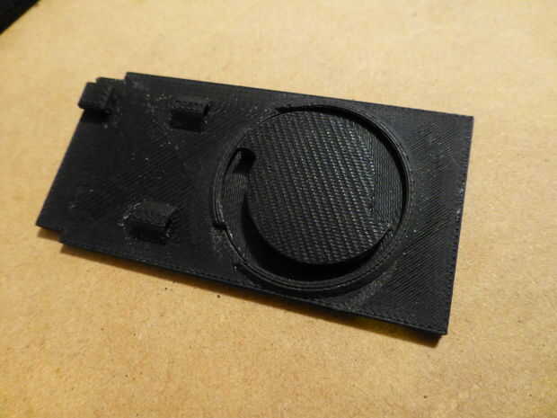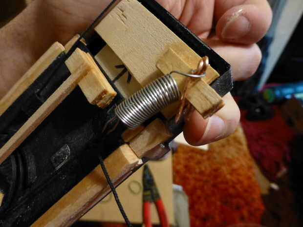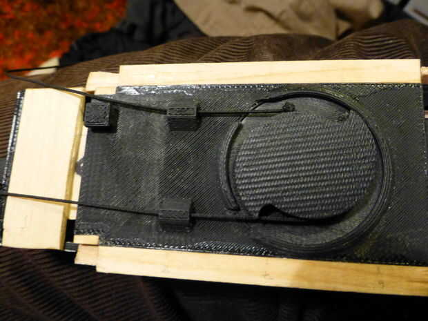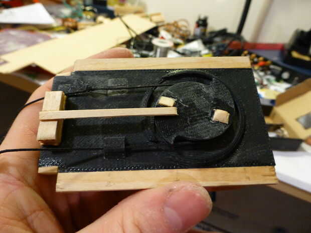 Podrá deslizar la palanca de cambios hacia adelante y hacia atrás a lo largo de las pistas en el caso en este momento y la hoja debe lanzar y suavemente. El mecanismo final ahora debe conseguir la hoja para accionar ambos adentro y hacia fuera con el mismo movimiento. La acción natural para esto es usar un círculo que gira 180 grados cada vez que tira del dedo. Para que cada rotación de 180 grados lleva el remite de la palanca de cambios y, a continuación, la siguiente actuación trae al revés. En esta pieza del mecanismo, la pieza del círculo que había impreso tiene una perilla en la parte inferior para cambiar de puesto la palanca de cambios con cada rotación 180. Es lo que convierte el movimiento rotatorio en movimiento lineal. En la parte superior de la rueda, hay de una ' forma (dos aletas). Como puede verse en el cuadro 2, la rueda tiene una capa de corte para permitir que la cadena ser tirado a través de la rueda a girar. La cuerda tiene un nudo que atrapa con los dientes de la rueda. Un extremo de la cuerda está atado a un resorte (podría reemplazarse por una banda de goma) y el muelle está conectado con el caso. El resorte tira de la cadena sobre los dientes de la rueda después de cada extracción. La rueda actúa como un trinquete. El otro extremo de la cuerda se ata entonces el anillo. Para ayudar en la capacidad de trinquete, lo modifico para incluir un diente (el palillo más largo) que cepilla suavemente a lo largo de la parte superior de la rueda. El diente trinquetes en 2 rampas separadas 180 grados (véase el último par de fotos). De esta manera, se permite una rotación (mirando) hacia la derecha, pero rotación a la izquierda se detiene en el diente por las rampas.