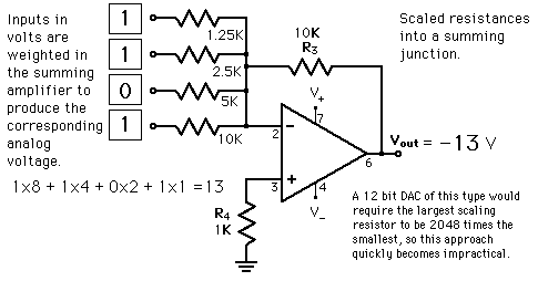 La figura incluida a continuación en esta sección se muestra un simple binario-weighted DAC construye conmutadores digitales (podría ser de un IC 4066 o interruptores individuales separados) y un conjunto de resistencias ponderadas conectado a un amplificador operacional. El amplificador operacional crea un amplificador inversor resistencia sumas de entrada Ren a través de un circuito de retroalimentación de R3. Los interruptores y resistencias actúan juntos como una resistencia controlada digitalmente que puede tomar una de 16 valores diferentes de resistencia. Esencialmente, esto proporciona una fuente de corriente controlada digitalmente. Cada nuevo código binario aplicado a las entradas genera un nuevo nivel actual discreto que se suma por R3 para proporcionar un nuevo nivel de tensión de salida discreta.