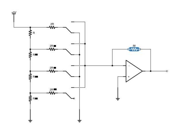 Donde Vref es 5V, y S0 S3 son los interruptores en la ilustración con S3 en la parte superior y S0 en la parte inferior. Suma es la suma de las corrientes en la entrada inversora del amp op y Rf es la resistencia de realimentación del amplificador sumador.