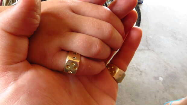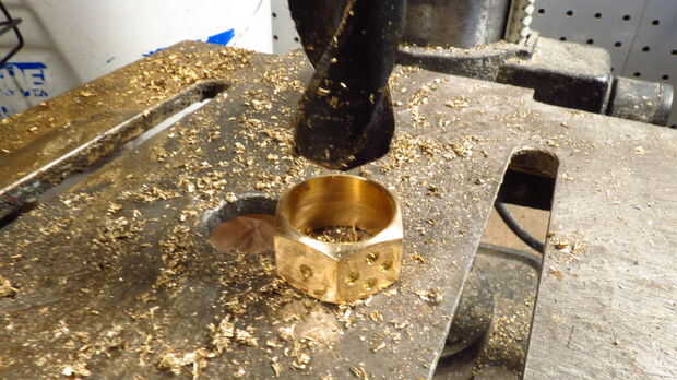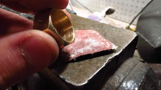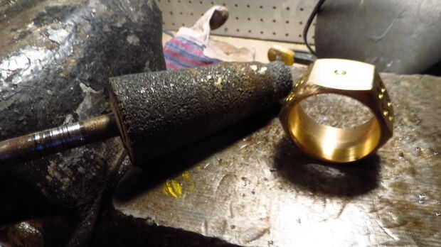 Todo lo que queda hacer es agujerear el interior. Recomiendo usar una broca del tamaño del dedo a que está apuntando. Si no tienes poco a poco puede moler las roscas con una redondo pulido piedra broca. Puede ir lento y se calienta el anillo algo feroz así que trate de algo que corta como un poco de giro o una lima redonda gruesa en lugar de algo que muele.
