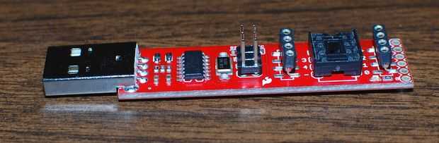 Este paso contiene las instrucciones para cargar el programa en el paso 8 para el ATtiny84 usando el programador de USPtinyISP de Sparkfun. En la foto del programador hay un conector de seis en el medio que he añadido. El programador viene con sólo los agujeros de montaje.