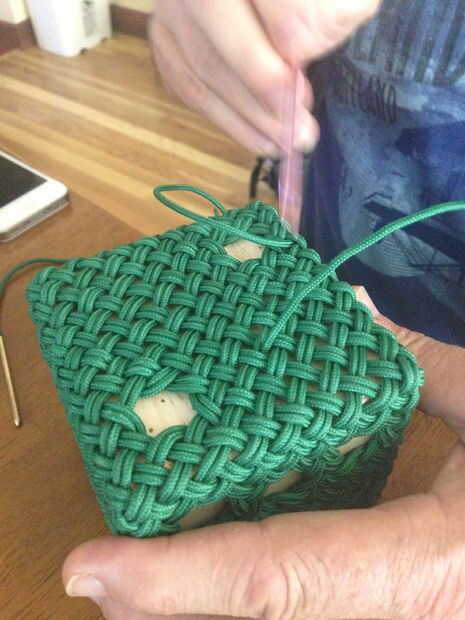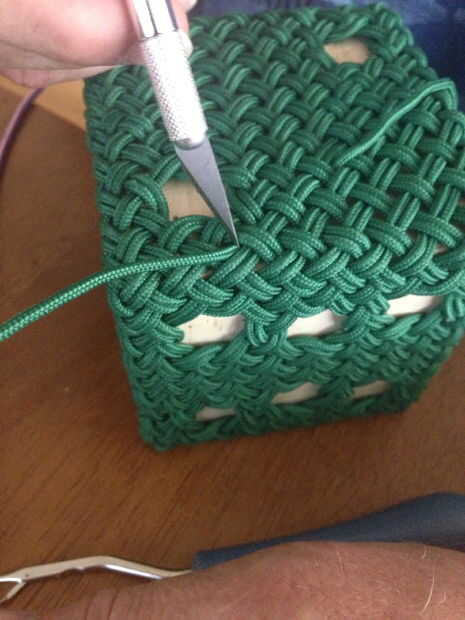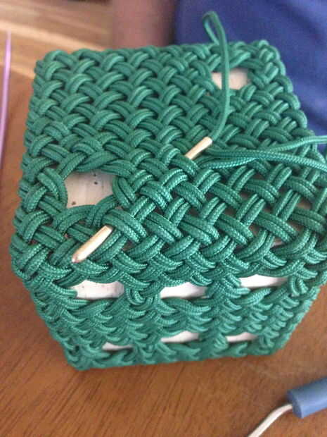 Acabar con la mayoría de los hilos en la cara 4. Para extender hacia fuera un poco, puede desentrañar un lado lo suficiente como para poner en una cara diferente y luego la reweave con el otro extremo. Luego meta el extremo bajo varios filamentos para ocultarla y mantener seguro y luego córtalo con un cuchillo afilado. Hacer lo mismo con el otro extremo. Repita el proceso con los otros 14 hilos!