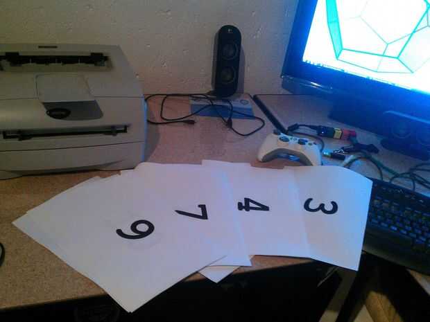 Usé papel A4 blanco con números negros impresos en ellas. Elegir un tipo de letra gusta, excluir el número menos favorito del 1 al 12 (la parte inferior no tiene ningún número), centro de un número en cada página, aumentar tamaño de fuente al gusto (300pt funciona bien para los pentágonos) e imprimir las 11 páginas. Alternativamente puedes pintar, dibujar, cortar, quemar, lo que los números en el papel.