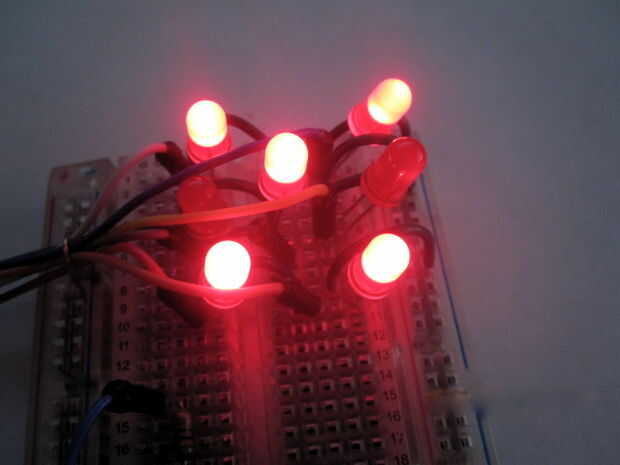 Esta instrcutable le mostrará cómo conectar LEDs para mostrar una cara de un dado, cuando se presiona un pulsador.Paso 1: fuentes de Para este proyecto, necesitará la siguiente:11 cables de puente largo7 cables de jumper corto7 LEDs1 protoboard1 Ardu