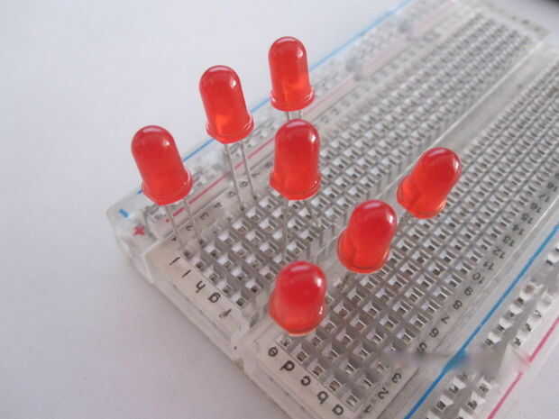 Enciende el LED 2 (5, 6 +) y 3 LED (9, 10). LED 4, en el centro, debe ser estirada entre (4-, 7 +). Los últimos 3 LED ir directamente debajo de los 3 primeros LED, pero en el otro lado de la protoboard.