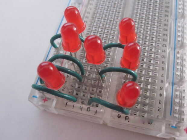 Esta instrcutable le mostrará cómo conectar LEDs para mostrar una cara de un dado, cuando se presiona un pulsador.Paso 1: fuentes de Para este proyecto, necesitará la siguiente:11 cables de puente largo7 cables de jumper corto7 LEDs1 protoboard1 Ardu