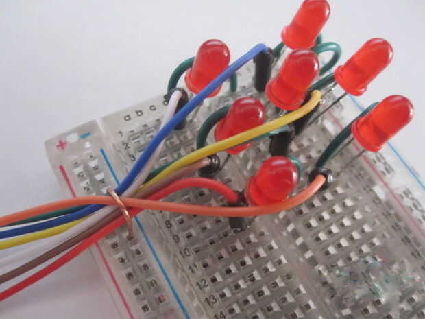 Ahora, a sus grandes puentes y poner un puente a cada lado del positivo (+) de los leds. Es mucho más fácil si usted código de colores los puentes, le ayudará más adelante. También conectar un puente grande para el carril de tierra, y que se conecte a la tierra en el arduino. En la lista era opcional, pero usé una pequeña paz de hilos de cobre revestidos presionado todos los puentes grandes.