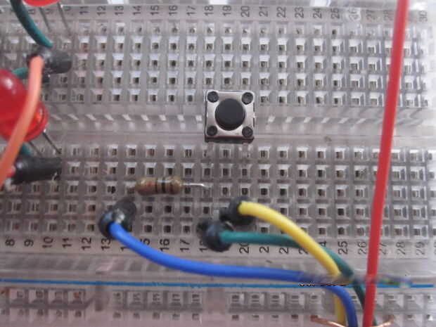 Ahora, conectar el pulsador. Comenzar colocando el pulsador en la placa, entre el crack en el tablero. Usé una resistencia de 100kohm, pero otros también funcionaría. Lugar dicho resistor sobre el tablero viene de uno de los pulsadores (ver el esquema para la comprensión adicional).