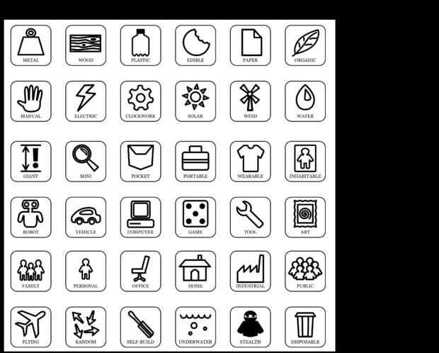 Se adjunta una versión PNG de alta calidad de este conjunto de iconos - pueden ser impresas en papel autoadhesivo y unir a prefabricados dados en blanco. Obviamente, estas no son las categorías solamente posibles de iconos para un sistema como esto, y otras posibilidades existen dentro de cada categoría.