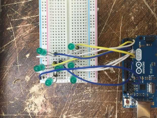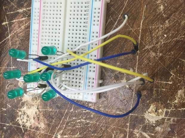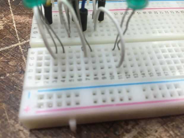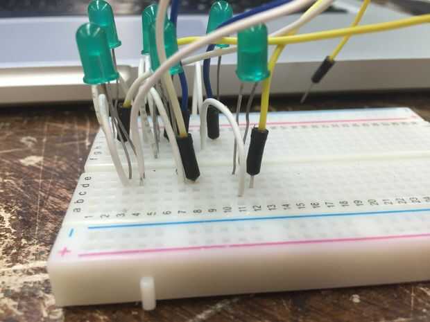 Ahora se toma 8 de los 11 cables largos y colocarlos en la placa sobre la otra pata del LED. Cada LED necesita un alambre largo y un alambre corto conectado a él. Una vez que los cables están enganchados a la Junta se colocarlos en los pines 1-7 en su Arduino.